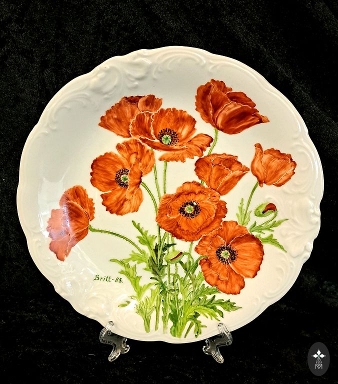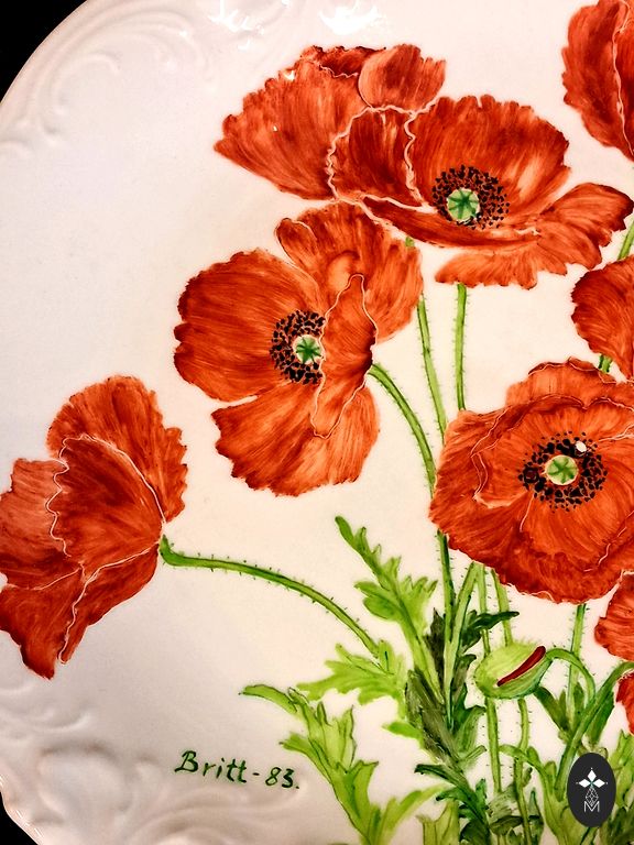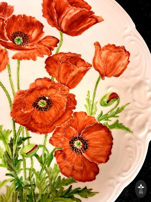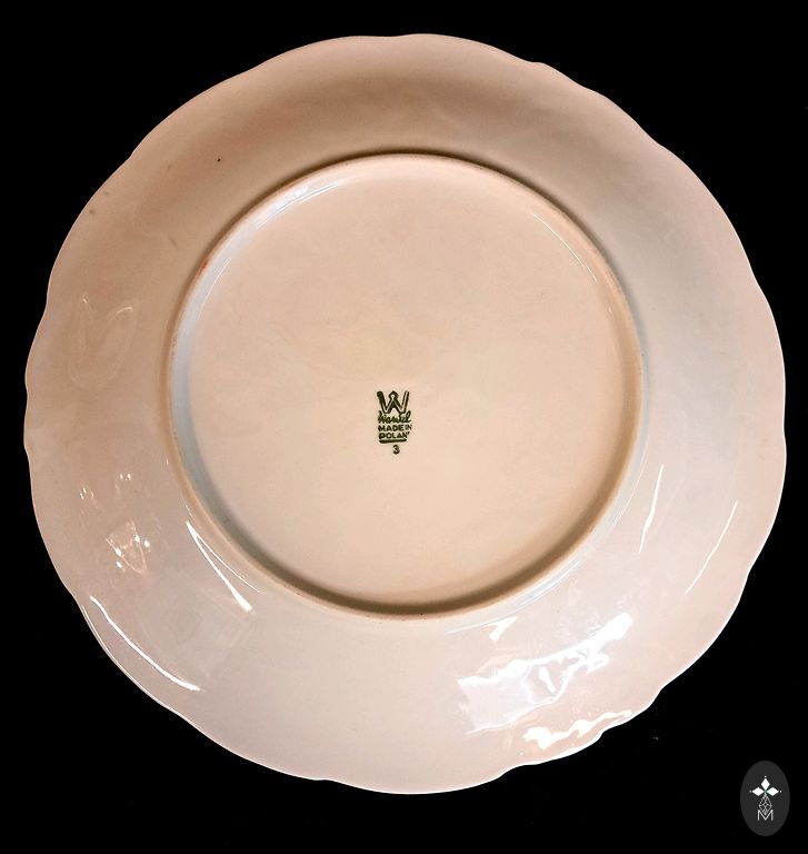 Рельефный, слегка волнистый край с мягкой бароко пластикой гармонично обрамляет декоративную композицию: изображение галантной пары, выполненное в технике деколи и заключённое в лёгкий, почти воздушный позолоченный орнамент с намёком на цветочные гирлянды.