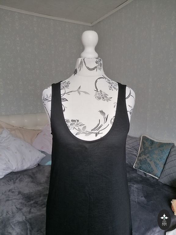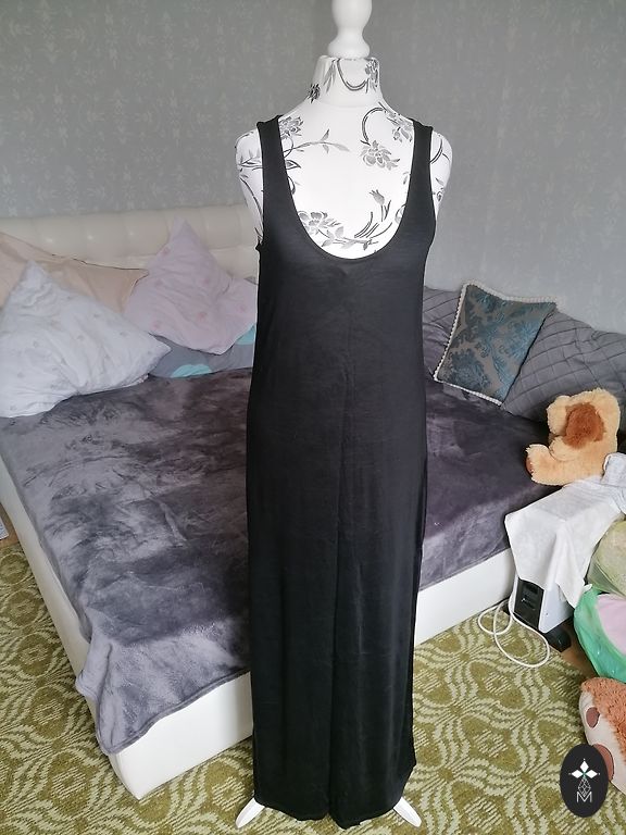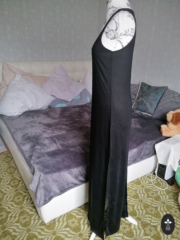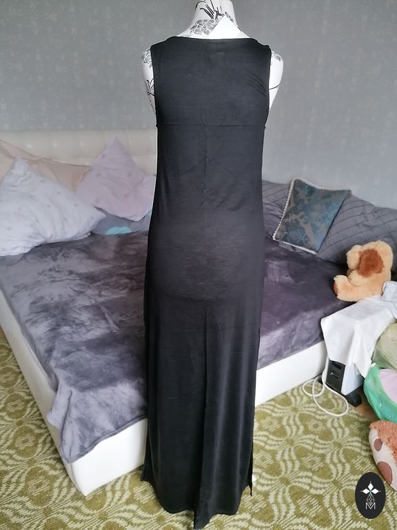Varpo formos rankovės, elastinė juosmens juosta, labai malonus ir laisvai krintantis viskozės audinys, suknelė nedėvėta, tik išskalbta, lengvai lyginama. Ilgis 125 cm, tarp pažastų 57 cm, juosmens apimtis maksimaliai ištempus gumą 118 cm.