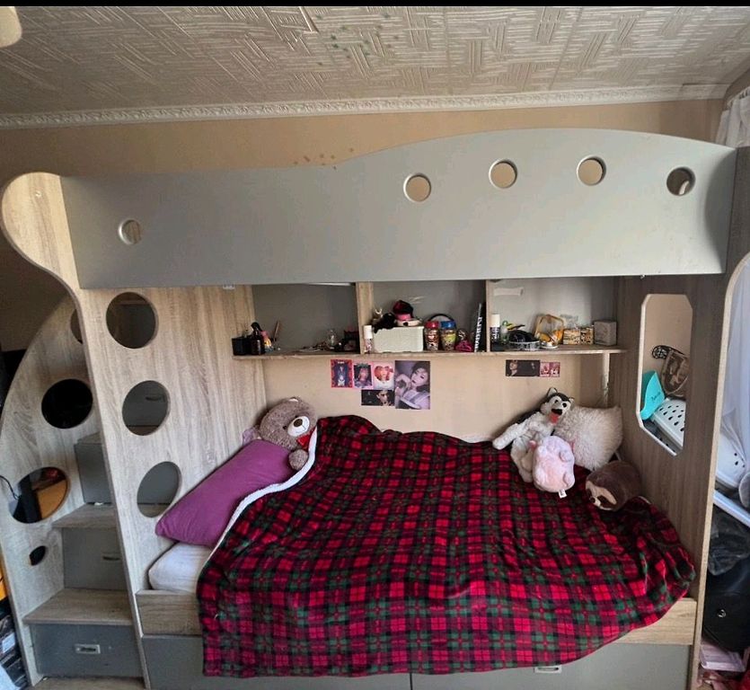 Müügil Kahekorruseline voodi. Alumisel korrusel väga avar laud, teisel korrusel voodi. Metallraam ja laminaatlauapind. Raamil on kleebistest jäänud jäljed ja plekid. Voodi osteti kasutatuna. Asub lahtivõetud olekus, müüakse ilma madratsita. Mõõtmed: 1,0m x 2,1m ja kõrgus 1,87m. Saadaval Struteles, 7 km Jaunpilist Tukuma poole!