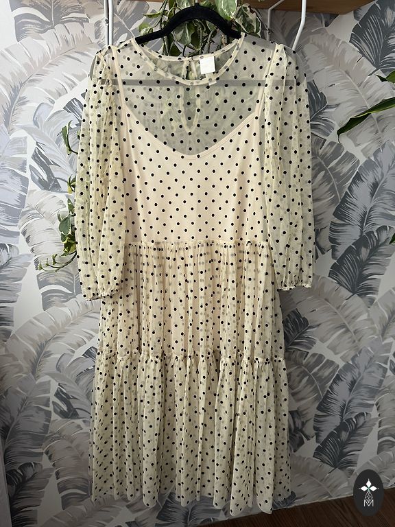 Beige, high-quality dress in excellent condition. Size 42, with a belt. Suitable for L or XL size. Composition: 69% cotton, 5% elastane, 6% nylon. Length 128 cm.