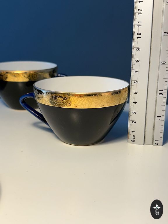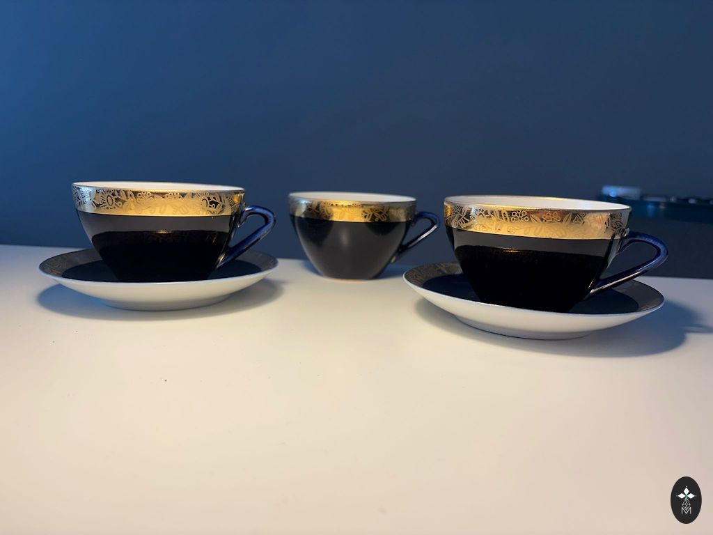6 mažos kavos puodeliai, importuoti iš Turkijos 20-ojo amžiaus 90-aisiais. Komplektas niekada nebuvo naudotas.
