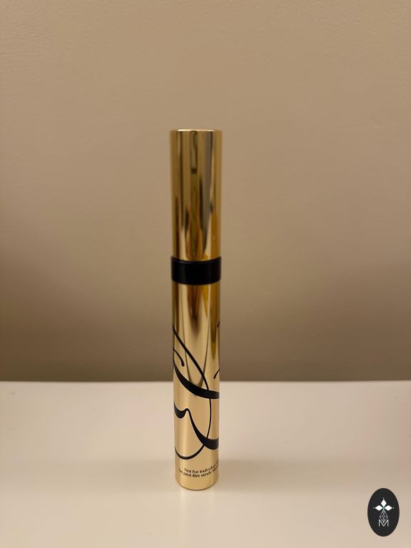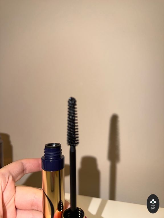 Mini tušas juoda, lūpų dažai ir juodas akių pieštukas kartu su kosmetine.
