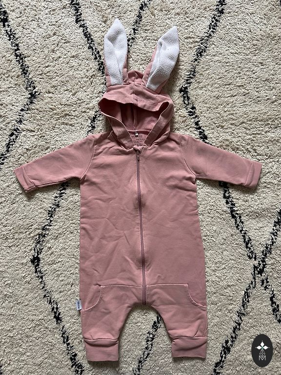 Puikus rožinis kostiumas / romperis Velykoms su žaliomis ausimis ir uodega, kuri netrukdo miegoti. Sudėtyje yra 5% elastano, kuris užtikrina kūdikio judėjimo laisvę. Geros būklės. Nedidelė dėmelė matoma 2-oje nuotraukoje. Manau, kad galima išplauti.
