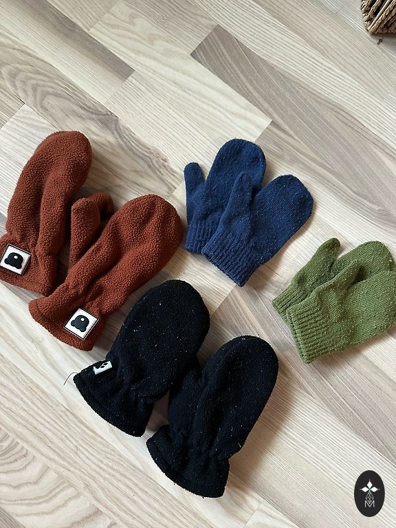 Kaks paari uusi kindaid, kantud hästi, ainult ühe korra. Nahaimitatsioon fliisvoodriga ja helkuriga ning softshell puuvillase voodriga. Sobivad lapsele vanuses umbes 80-92 suurust.