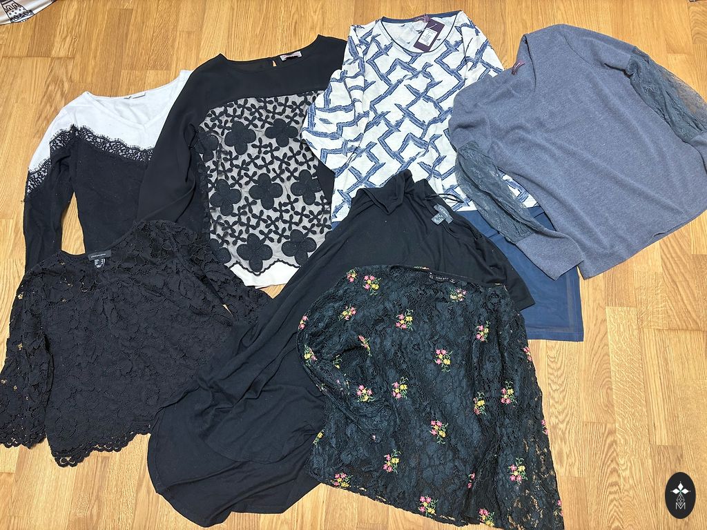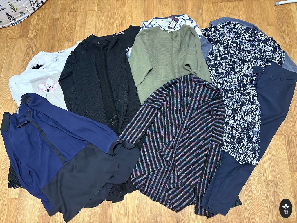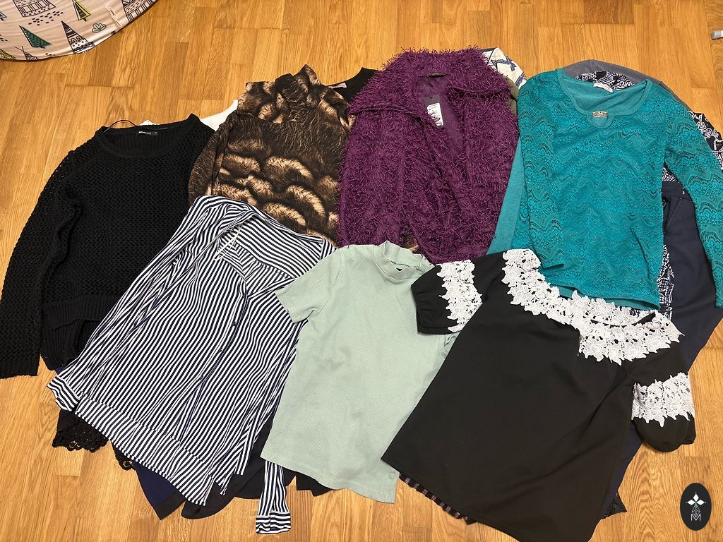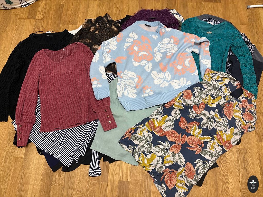 More pictures can be sent privately, clothes are size M and L, not all clothes are shown in the second picture. The thick sweater is labeled xs, but will fit M. Various brands - h&m, reserved, fb sisters... Dresses, shortsuits, sweaters, t-shirts.