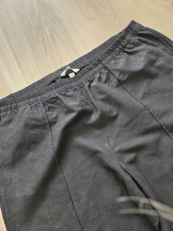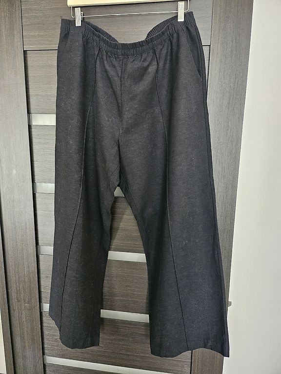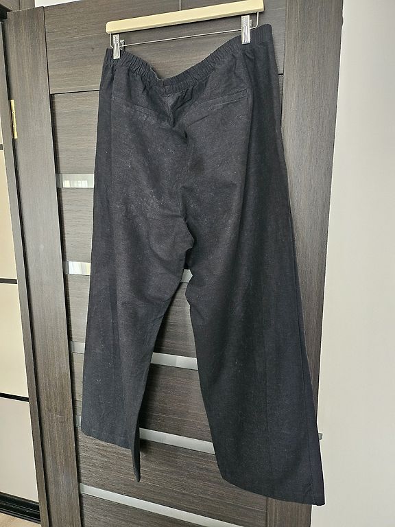 Kelnės yra iš dirbtinės odos su plačiais galais.
