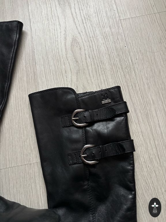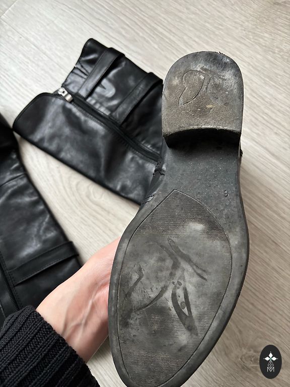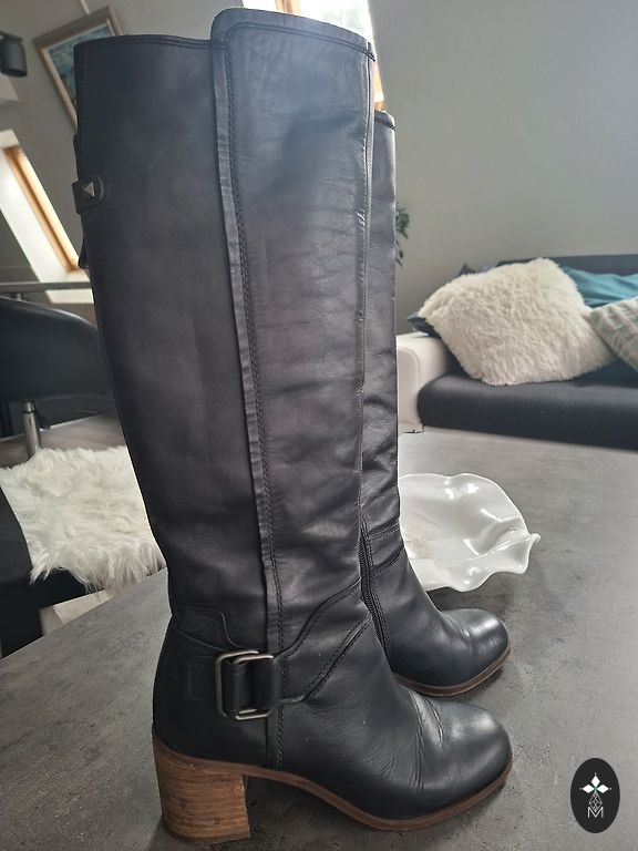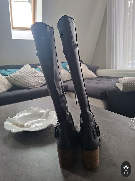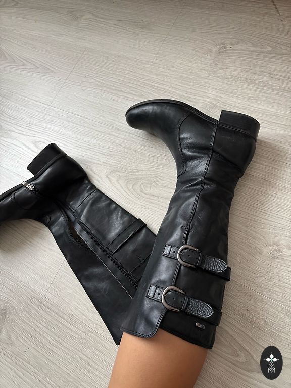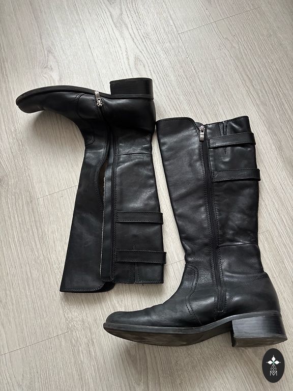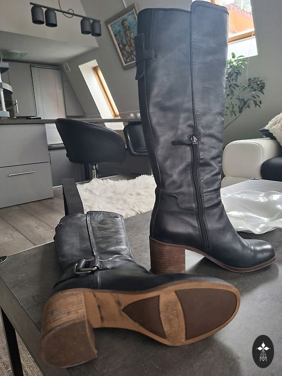 Natūralios odos batai, ilgis virš kelio. Nurodytas dydis 39, bet gana laisvai tinka, pagal pojūtį 39,5/40.