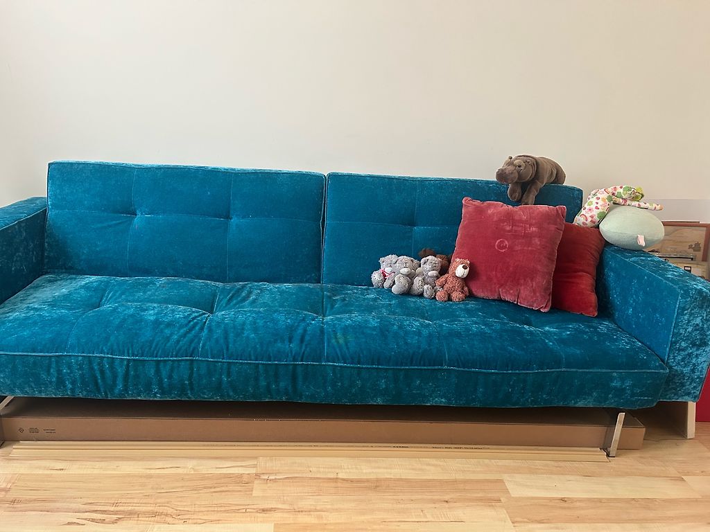 Очень удобный, мягкий диван, единственные недостатки - выпавшие пуговицы (можно купить в любом магазине тканей/канцелярских товаров), а также необходима химчистка (цена с выездом на дом около 60-70€) или снять чехлы и постирать в стиральной машине.