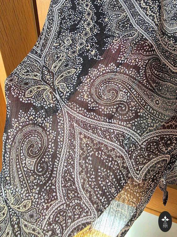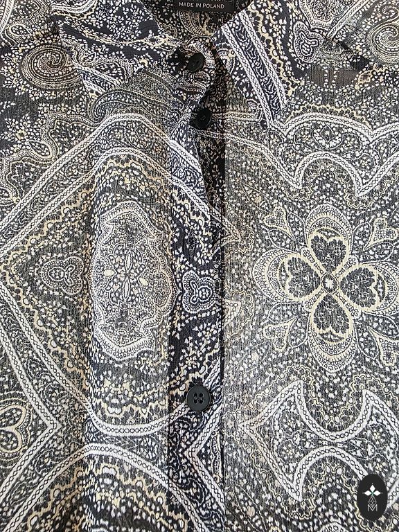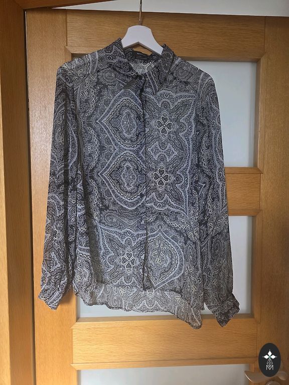 Продаю слегка блузку бренда Norm в серых оттенках с тонким полосатым узором. Эта блузка выделяется своими деталями - на спине у нее есть элегантная черная завязка на воротнике и легкое сетчатое удлинение внизу, которое придает образу оригинальность.