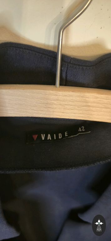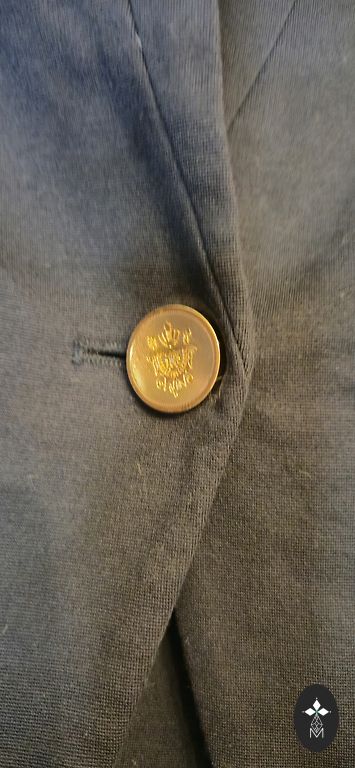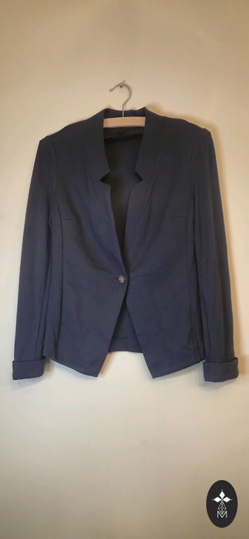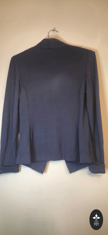 Colorful jacket with a geometric pattern and double-breasted button closure. It has small shoulder pads to maintain the jacket's shape. The pockets are faux.