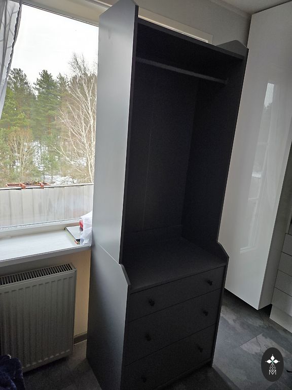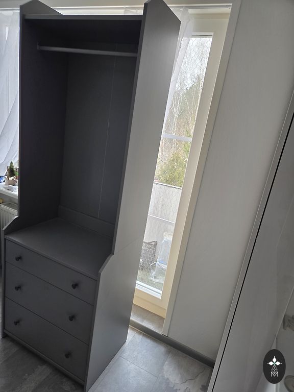 Selling a two-door wardrobe, the frame is a light oak imitation, the doors are grey. Inside there are two drawers and a shelf. Such a configuration costs €279 at Ikea, selling for €180. Must be disassembled and taken away by the buyer. Riga, Āgenskalns.