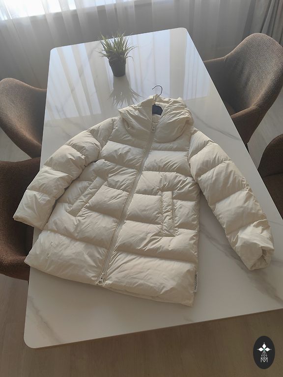 The jacket is in a milk-white color, without defects. Measurements: hips 51, chest 49, length 75cm.