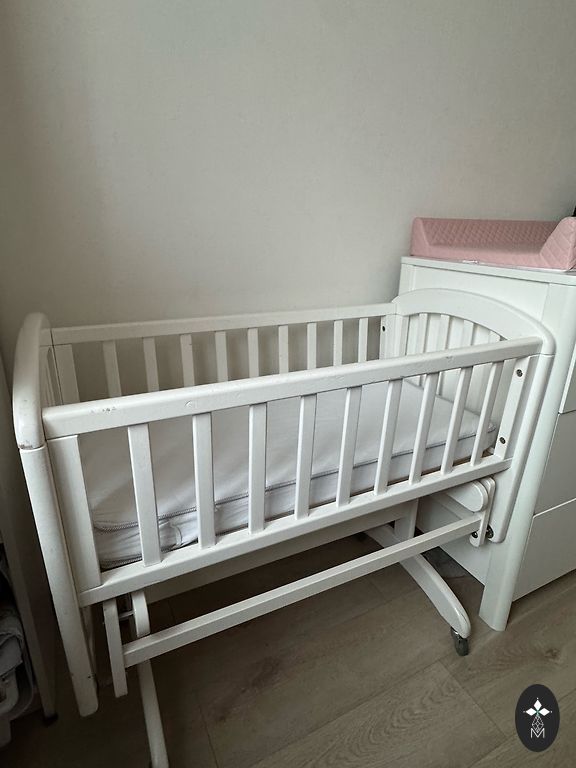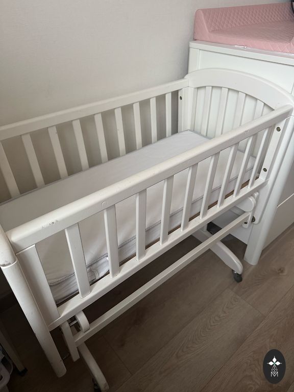 Детская кроватка. С опускаемой стороной. Сторона заедает. Опустить и поднять можно, но сложно. На кроватке есть накладки на боковины. Визуально царапины. Не новая.