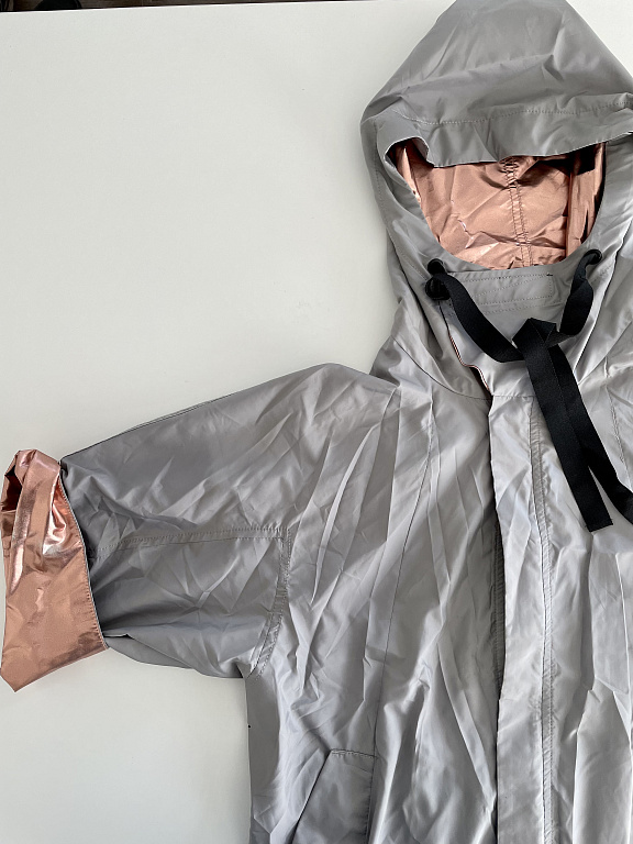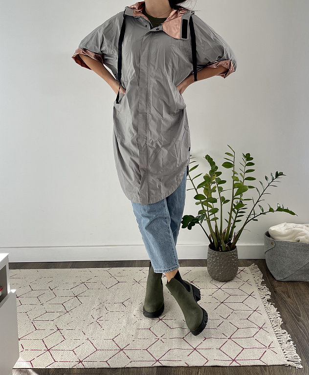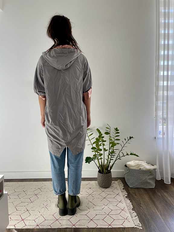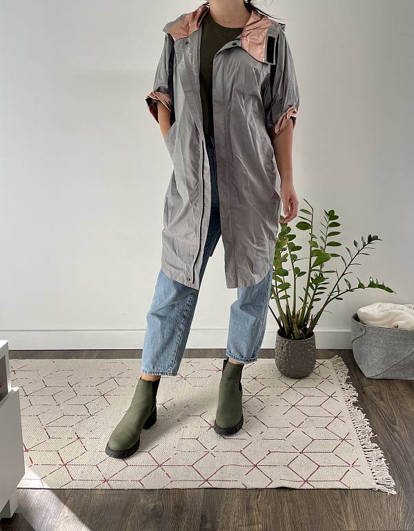 Aktuaalne mantel. Saab vööd tihedamalt tõmmata, luues mantli alaosale kohevama ilme. Õlgade laius 41 cm, mantli pikkus 97 cm.