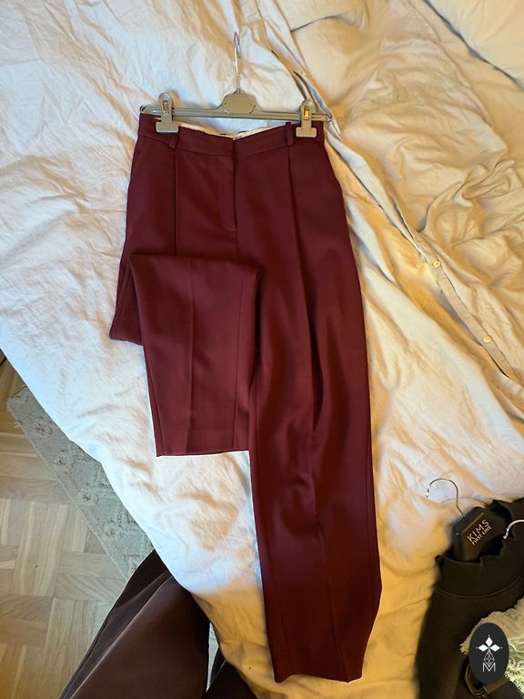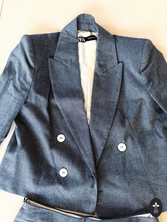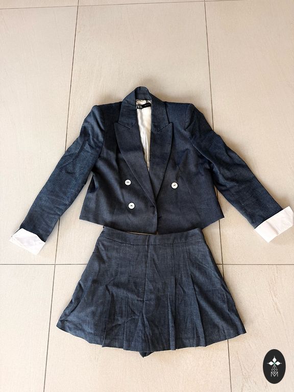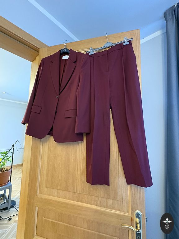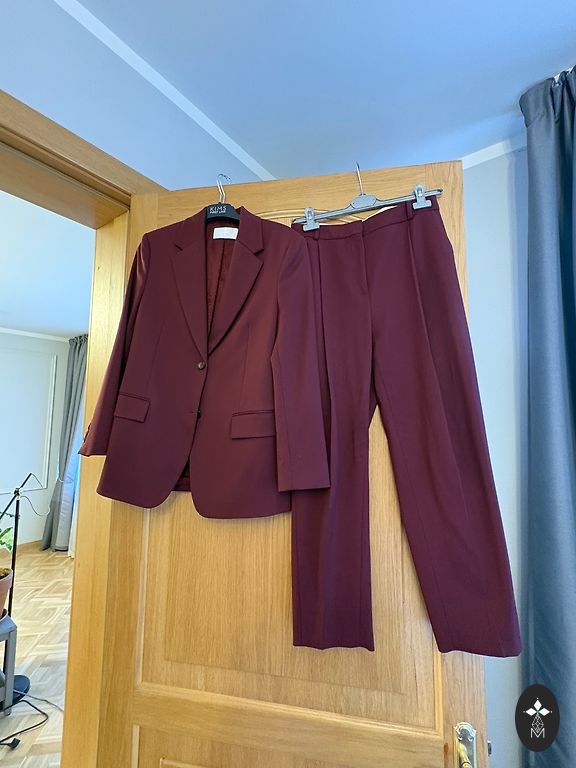 Klasikinis juodas kostiumas. Švarko dydis 36, pirktas sau kaip M dydžiui, o kelnių dydis 38. Kelnių gale yra elastinė juosta. Ant rankų mygtukai šiek tiek nusitrynę nuo plovimo.