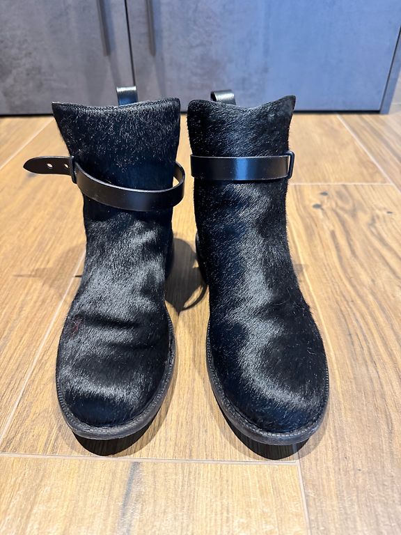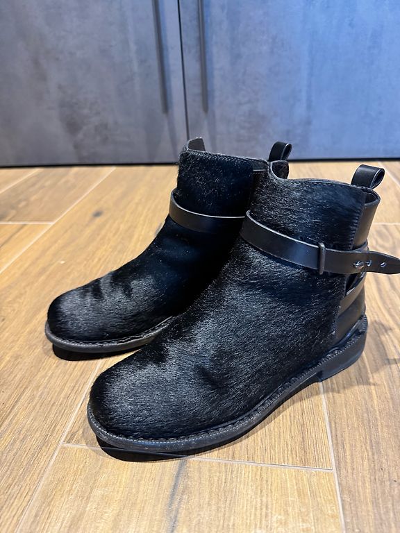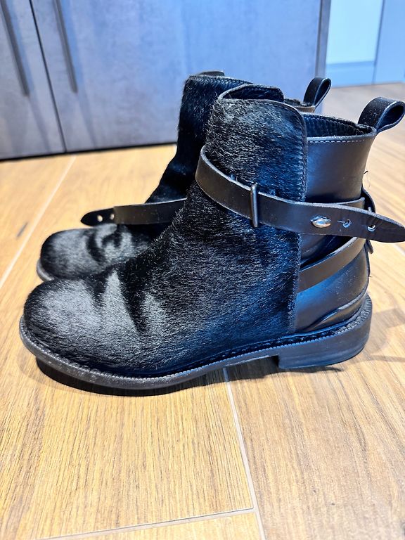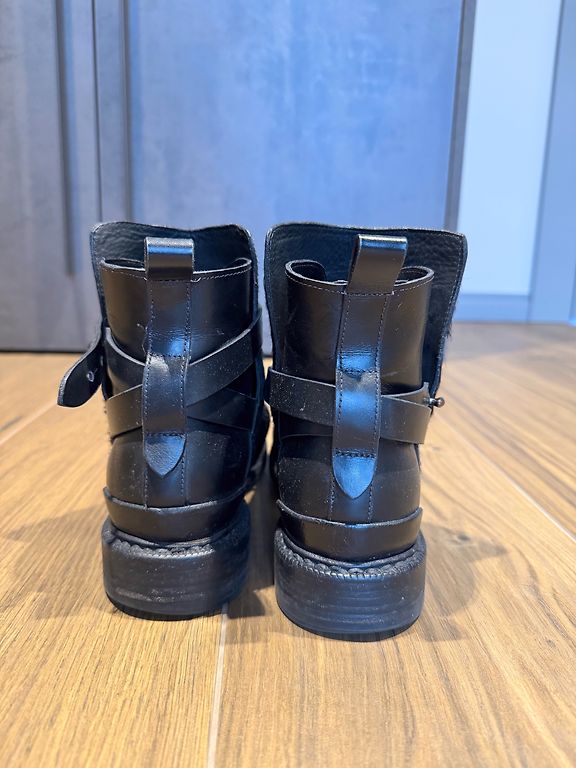 Juodi moteriški batai su raišteliais, pagaminti iš odos. Batai yra iki kulkšnies aukščio, su storesniu, stabiliu padu. Priekyje yra dekoratyvinė metalinė plokštelė su užrašu „INCH²“, kuri suteikia batams modernų ir šiek tiek rokerišką stilių. Vidus šviesios spalvos, batai užsegami raišteliais. Būklė gera – matomos nedidelės naudojimo žymės ant nosies metalinės dalies.