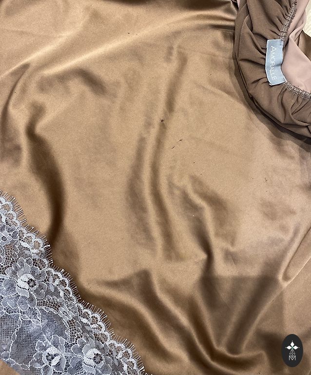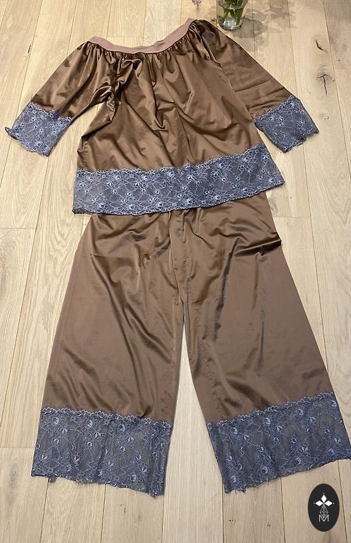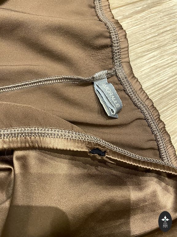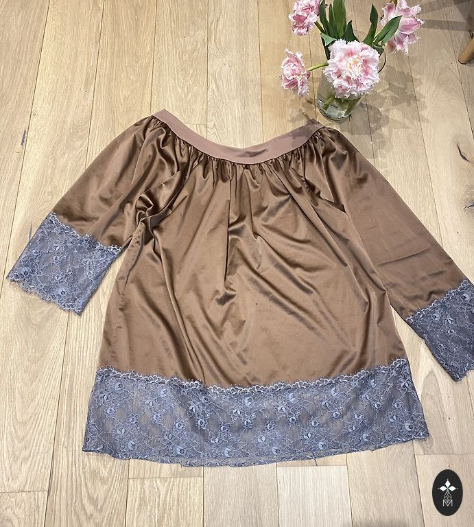 Väga elegantne kleit. Pehme, elastne kleit, mille paremal küljel on kuldne pitsiga ülekäik. Selle osa seotakse sametpaelaga. Kaela ja käeotste viimistlus samuti sametiga.