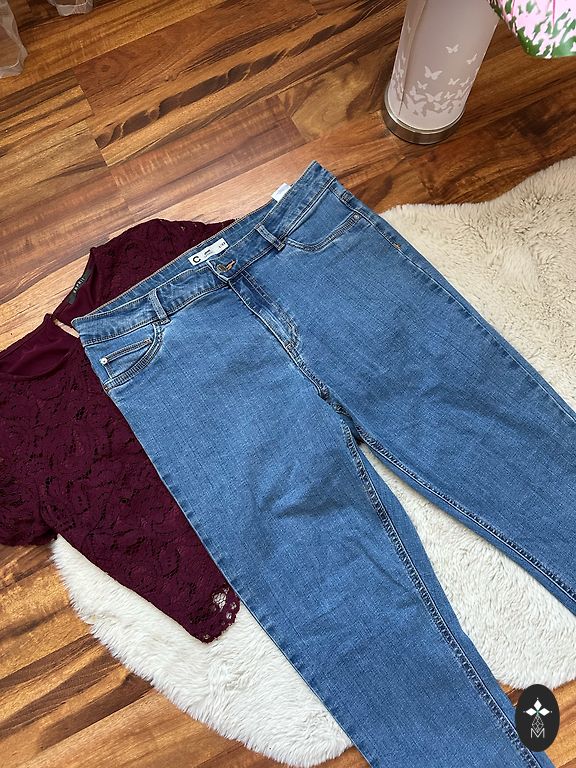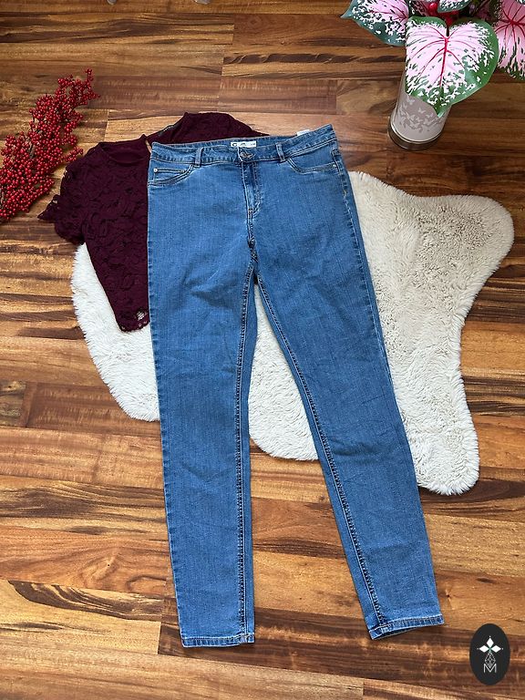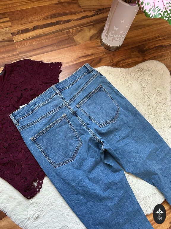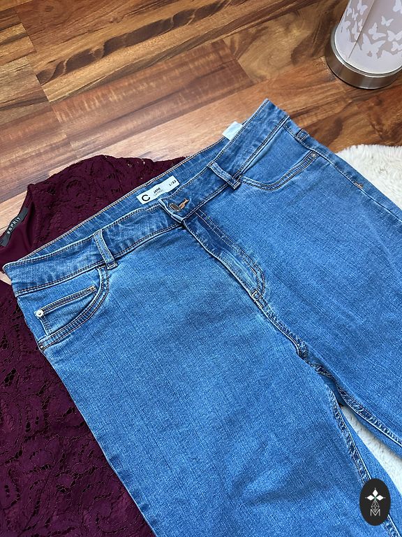 Pikkus 103 cm, sisetükk 74 cm, vöökoht 38 cm, kõrge vöökoht. Elastsed
