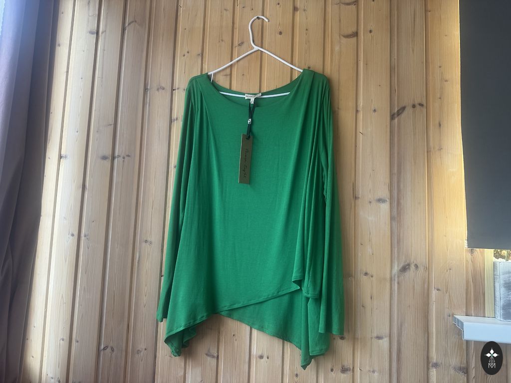 Pikkus 105, küljed ümardatud. Kaenlaalustes 60, puusades 65 cm, elus erksam.