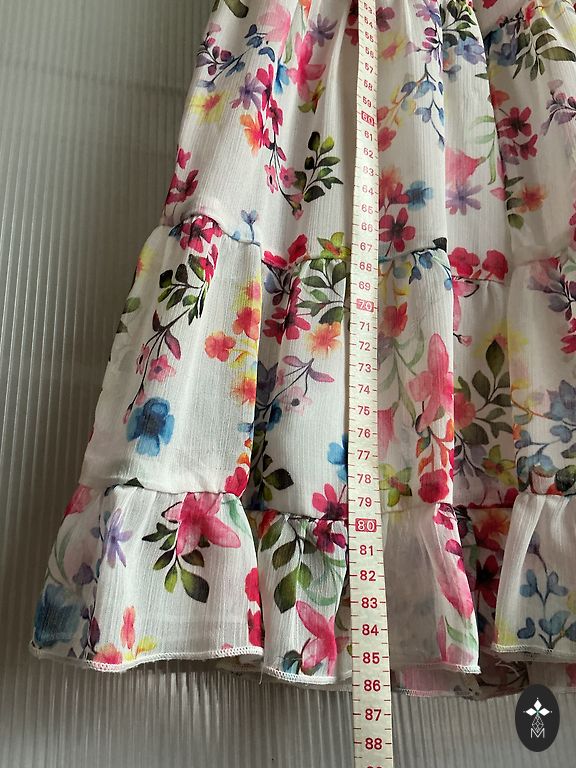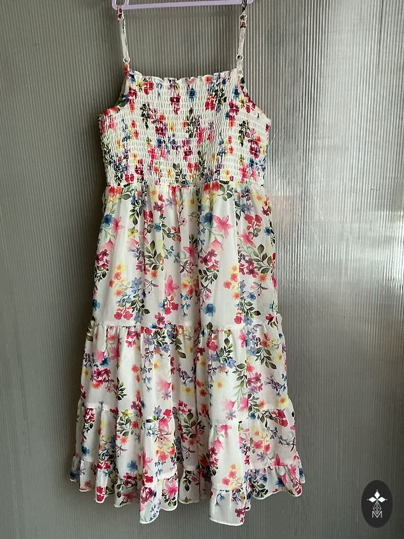 Graži suknelė - užpakalinėje dalyje užtrauktukas, surišamas dirželis (galima reguliuoti suknelės plotį). Ilgis 78 cm, plotis 34 cm. Gamintojo nurodytas dydis 140. Medvilninis pamušalas.