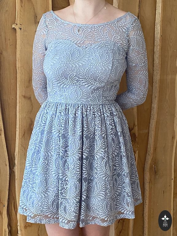 Elegant light blue mini dress with an impressive open-back design. The dress features long sleeves with soft tulle ruffles at the cuffs, adding a playful and feminine touch. The back is beautifully open, making the dress perfect for special occasions, parties, or photoshoots.