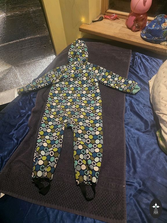 Vaikiškas pavasario/tarpsezoninis kombinezonas. Atsparus vandeniui, audinys taip pat atsparus vėjui, viduje fliso pamušalas.