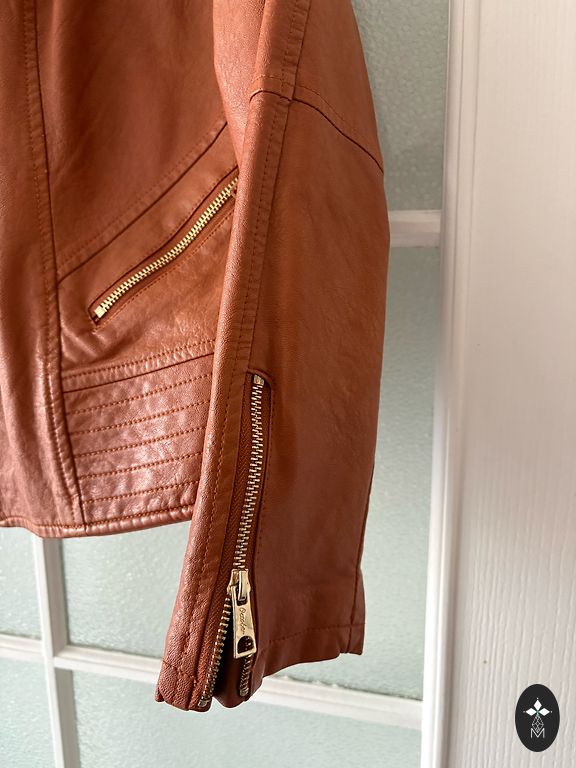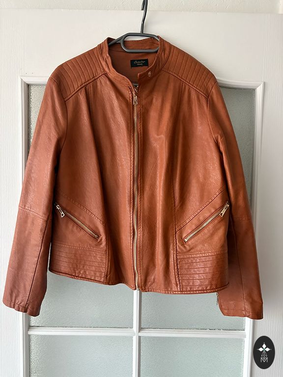 Grunge stiliaus dirbtinės odos motociklininko striukė. Dydis L, laisvo kirpimo. Dėvėta tik kelis kartus, puikios būklės. Senovinis išplautas efektas.