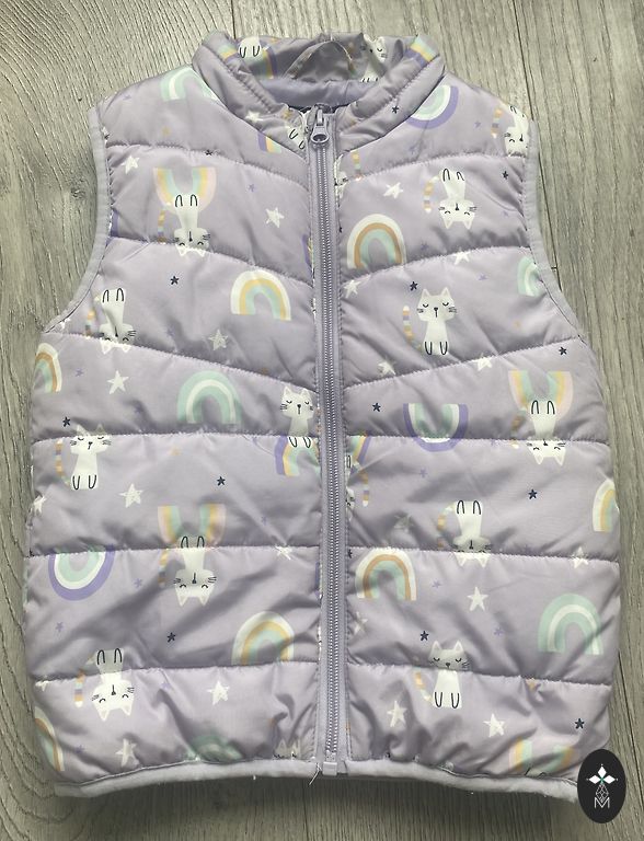 Жилет 2в1. Можно носить с обеих сторон. В очень хорошем состоянии, на цветочной стороне небольшой дефект, который трудно заметить. На бирке указано 128, но если хотите надеть под низ более толстый свитер, рекомендую для детей помладше. Дочь носила в возрасте 5-6 лет.