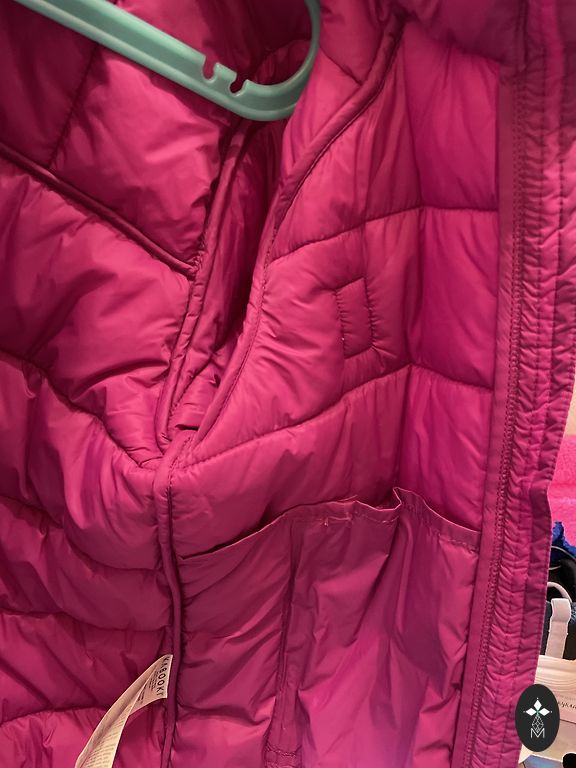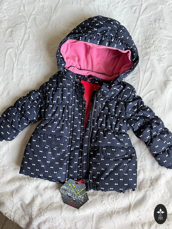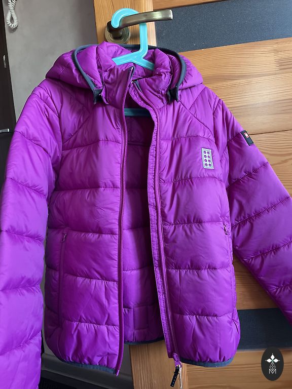 Kerge jakk tüdrukule väikese täidisega, tumesinine. Mugav reisimiseks, kergesti kokkupandav, on kapuuts, tõmblukk sulgub kõrgele, sallita saab hakkama. Suurus 164 cm. Pikkus 59 cm, laius kaenla alt 52 cm. Sildid eemaldatud, kuid jakk ei ole kantud. Kohaletoimetamine ei sisaldu hinnas.