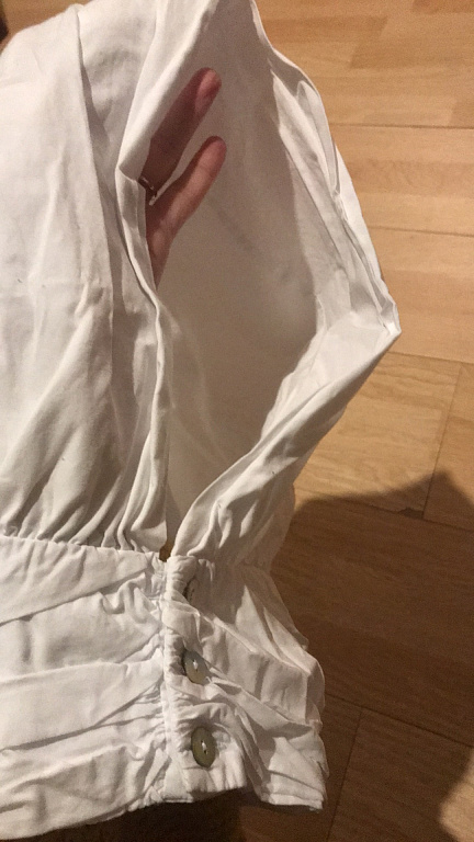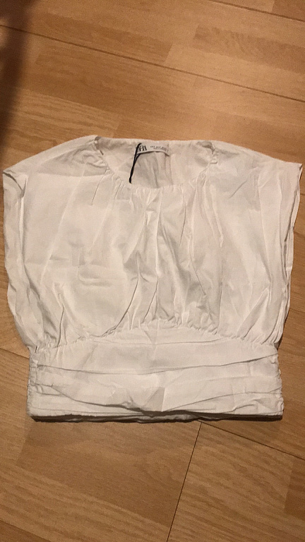 Новый топ в полоску. С широким, красивым рукавом. Размер С, хлопок. По спинке 48 см. Плечо немного спущено. Свободный фасон, в груди 51 см. Ширина рукава 18 см.
