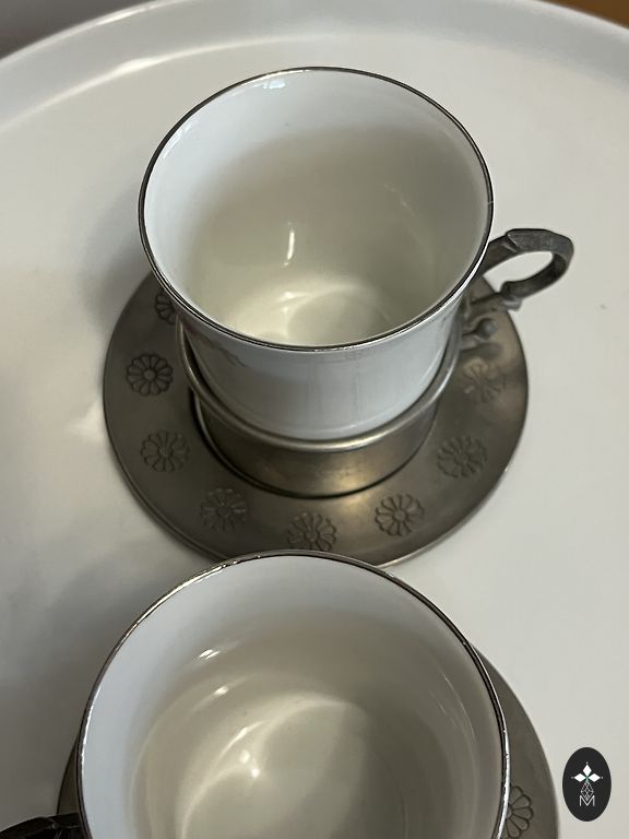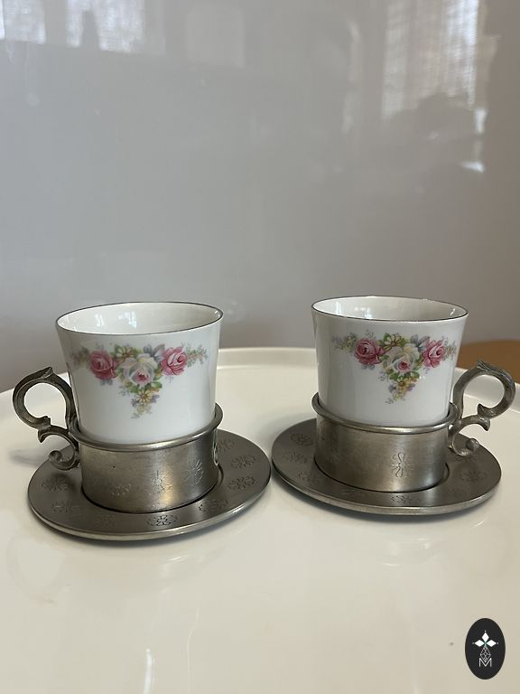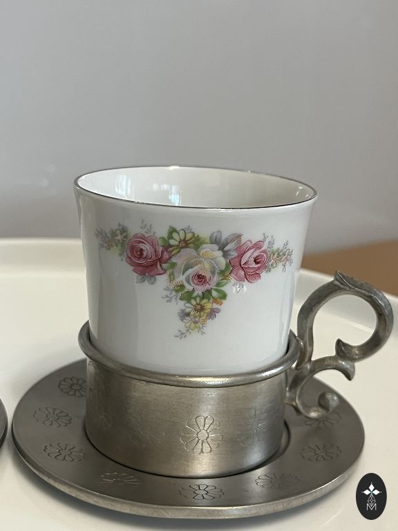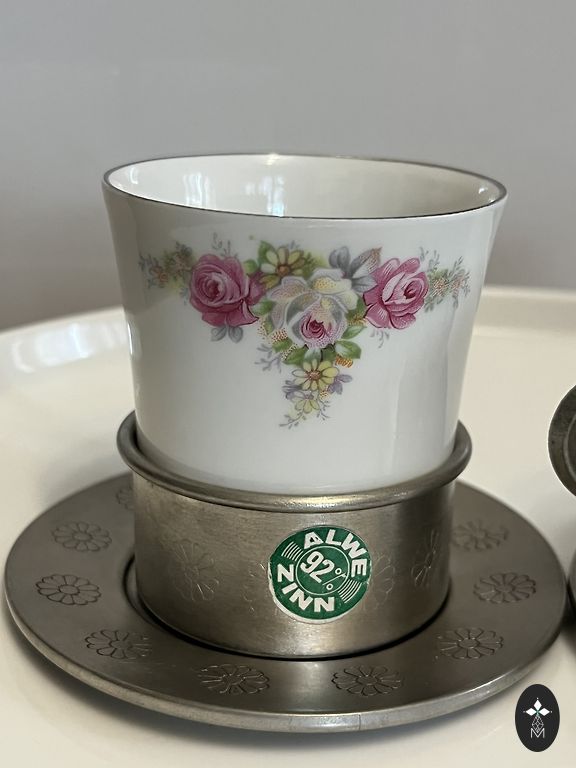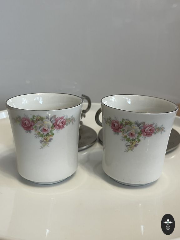 zīmogs “KAHLA – Made in GDR”. Skaista vintage porcelāna servīze ar ziedu rakstu un zelta maliņām.Trauki ļoti labā stāvoklī – praktiski nav lietoti, lielākoties stāvējuši skapī