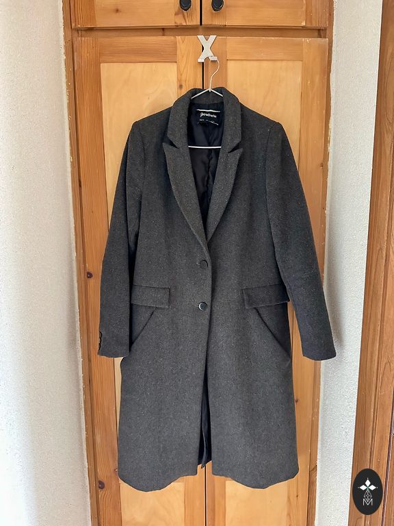 Pavasarīgs mētelītis ar modernu platu apkakli ar volāniem. Uz birkas izmērs M, bet vairãk atbilst izmēram S. Varu noņemt mērījumus.