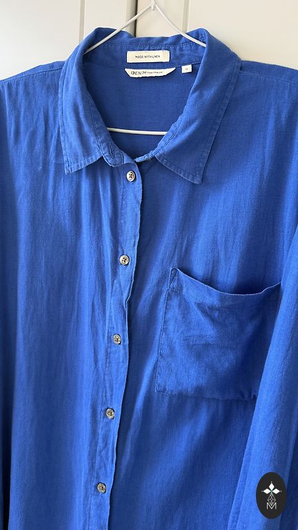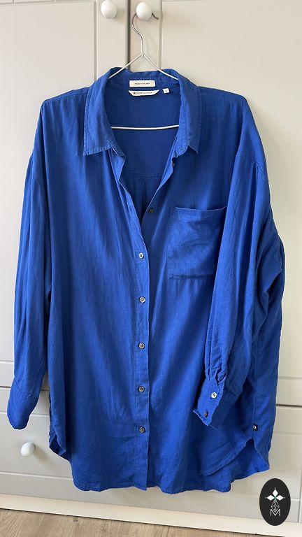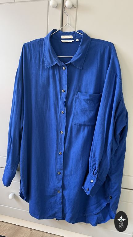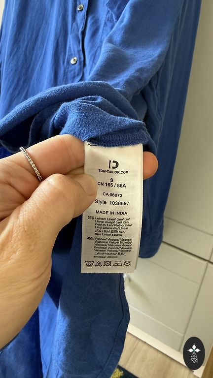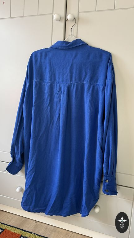 The manufacturer's indicated size is 12, but it will fit an S; check the measurements. A light, airy blouse in trendy shades - beige, blue, gray, black. Perfectly combinable with clothing in these colors to make the overall look more feminine. Sleeves in one layer, but the rest of the part has two layers. Zipper on the sides, button closure at the back.