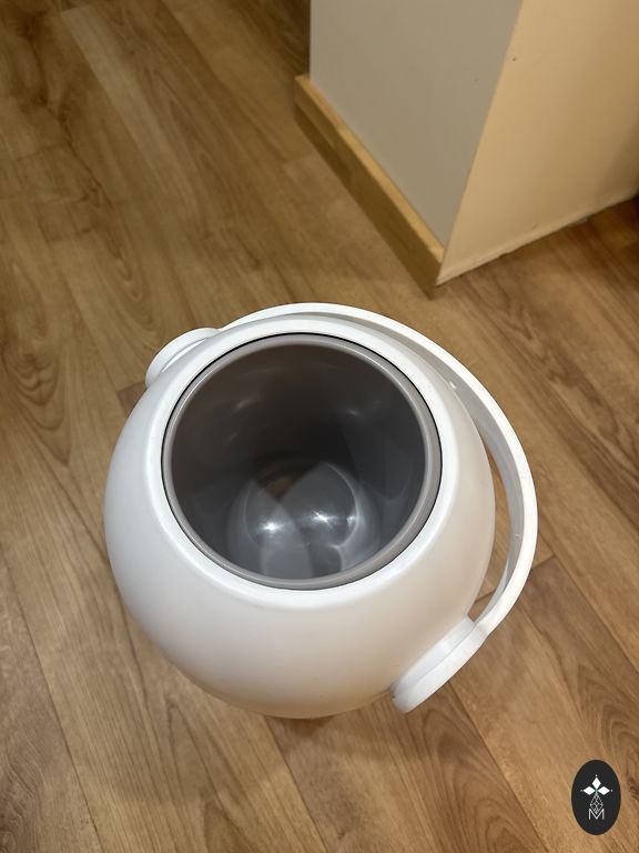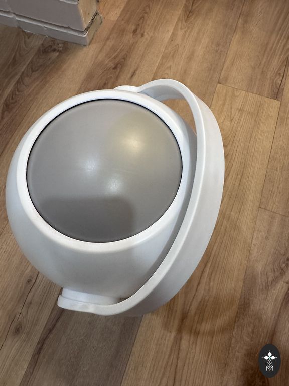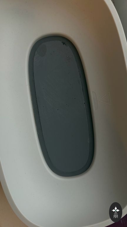 Naudojimo metu nusiplauna vandeniui atsparus sluoksnis. Spalva - labiau pilkai balta, kai kuriose vietose yra dėmių. Nesuplyšęs. Atlieka savo funkciją, kad sėdėjimas būtų minkštesnis.