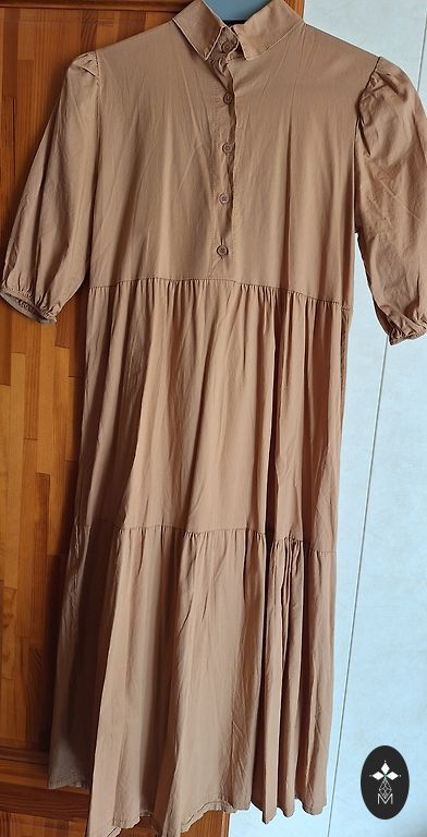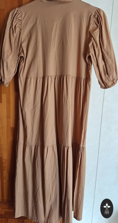 Gara kleita, priekšā nedaudz īsāka. Pleci pliki bet roku daļa nosedz.