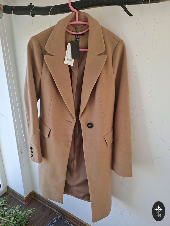 Pilkas, plonas paltas, be pamušalo, yra kišenės. Naujas. Mišri sudėtis. M/L dydžiui. Ilgis 97 cm, plotis krūtinėje 58 x2 cm.