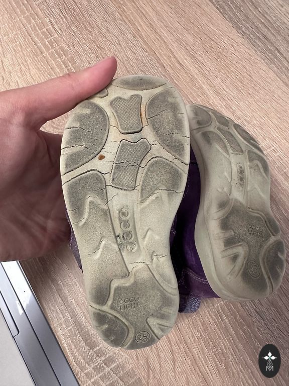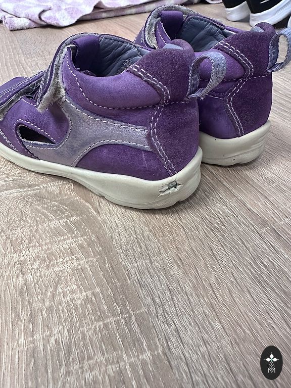 Есть следы износа. Дефект виден на фото- немного порвалось резиновое покрытие спереди. Липучки хорошо липнут. Стелька 16 см. А в целом можно еще поносить.