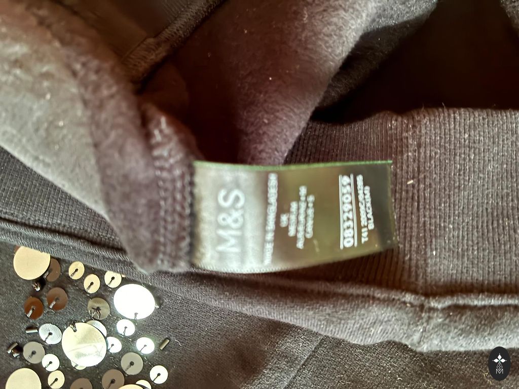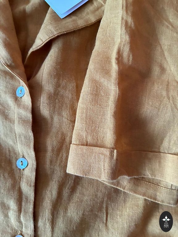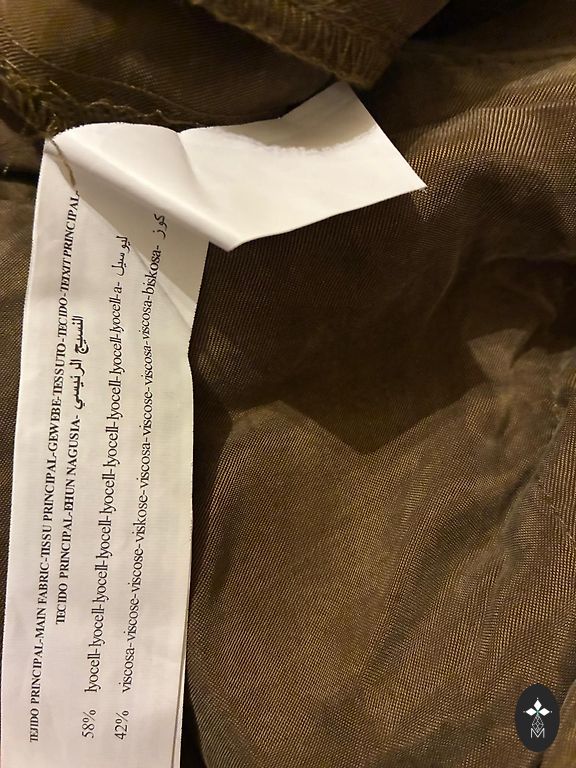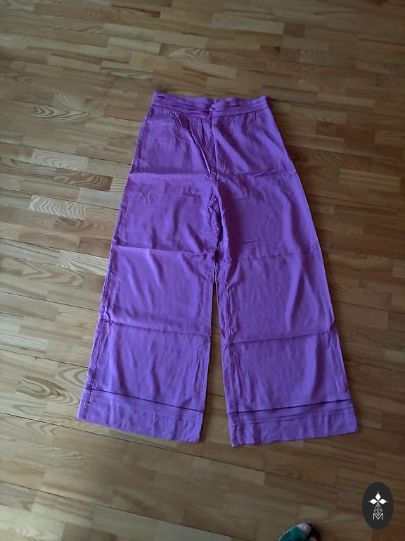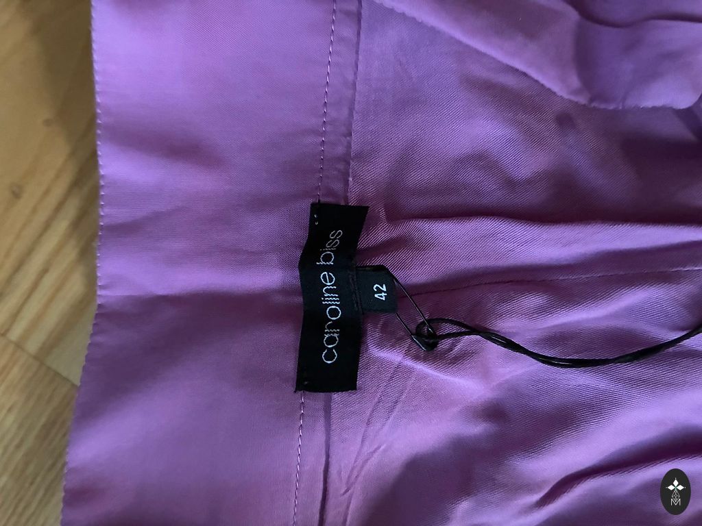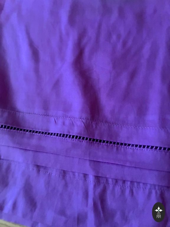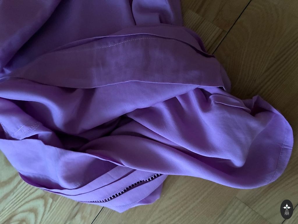 Kupla kokvilna ar sudraba diegu ieaustu audumā kleita ar garām piedurknēm, priekšā sasienama. Gara. Muguras garums 131 cm,piedurknes garums 65 cm, piedurknē apakšā ir gumija, var pacelt uz augšu, ja par garu. Krūšu apkārtmērs 106 cm, gurnos plata līdz 140 cm, apakšā platums 330 cm. Nīderlandes izmēŗs 36