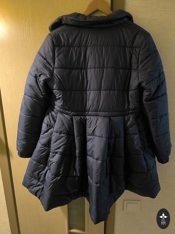 Classic peacoat-style coat in dark blue color. Double-breasted buttons in gold color. There are 2 side pockets. It has been worn, so there are noticeable signs of wear up close, but overall it is very well preserved and maybe someone is looking for exactly this kind for a cheap price :) because it looks very beautiful when worn, the style remains consistently fashionable. Size: 42 (UK 14) Coat length: 81 cm. Composition: polyester (48%), acrylic (45%), wool (3%), viscose (2%), nylon (1%), cotton (1%).