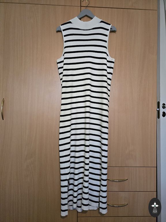 Ilga, laisva lininė suknelė puikios būklės, yra kišenės, šonuose diržo kilpos, deja, pats diržas nėra išlikęs, bet manau, kad jį galima pakeisti kitu, pvz., odiniu dirželiu. Suknelės ilgis 135 cm, plotis pažastyse 64 cm, klubų plotis 65 cm.