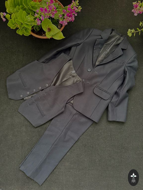 Uzvalks derēs smalkam, slaidam zēnam bērnu dārza izlaidumā, vai uzsākot skolas gaitas. Norādītais izmērs ir 8 gadu vecam, taču derēs vairāk 6/7 gadīgam. Buktētas bikses, viduklī regulējams apkārtmērs ar gumiju un podziņu. Bikšu staru garums no stakles 56cm, piedurkņu garums no pleca 48cm. Vidukļa apkārtmērs žaketītei 70cm.