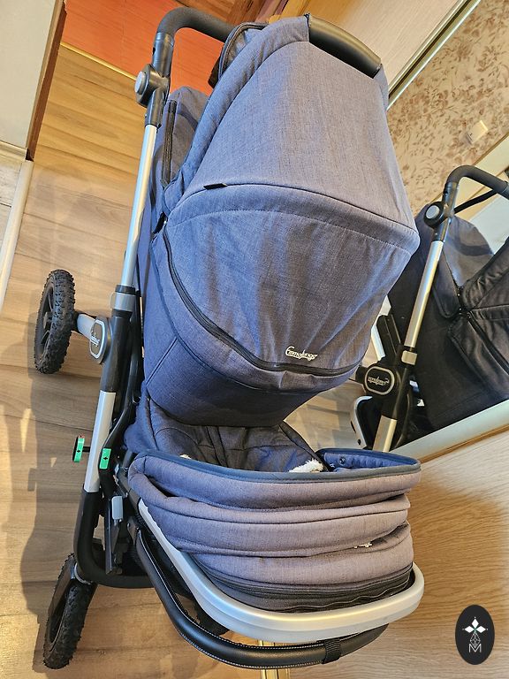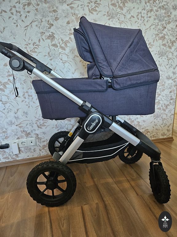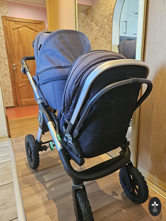 Signs of usage are visible. The bassinet can also be converted into a seat and used as a stroller for two larger children. Included are a basket for the mono version, a stroller bag, two original sleeping bags, and rain covers.
