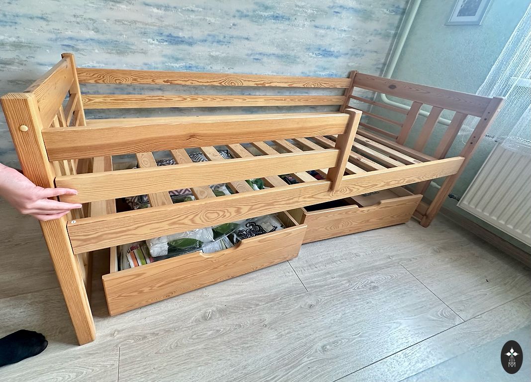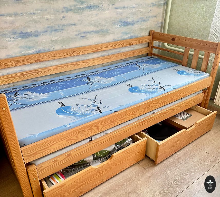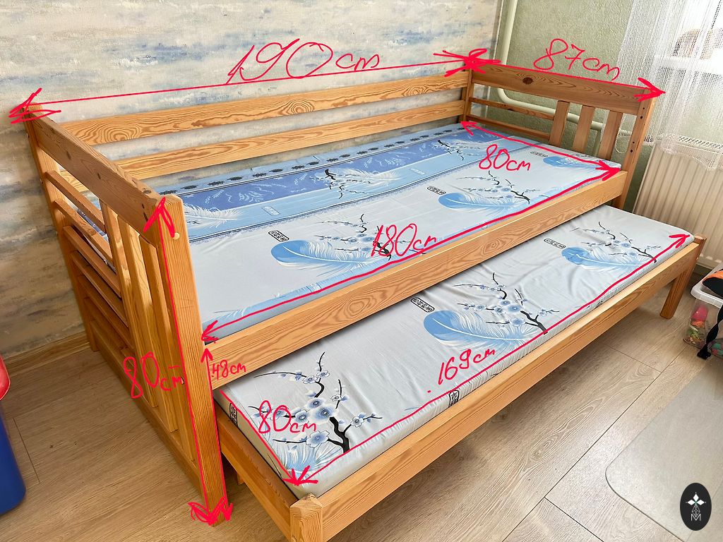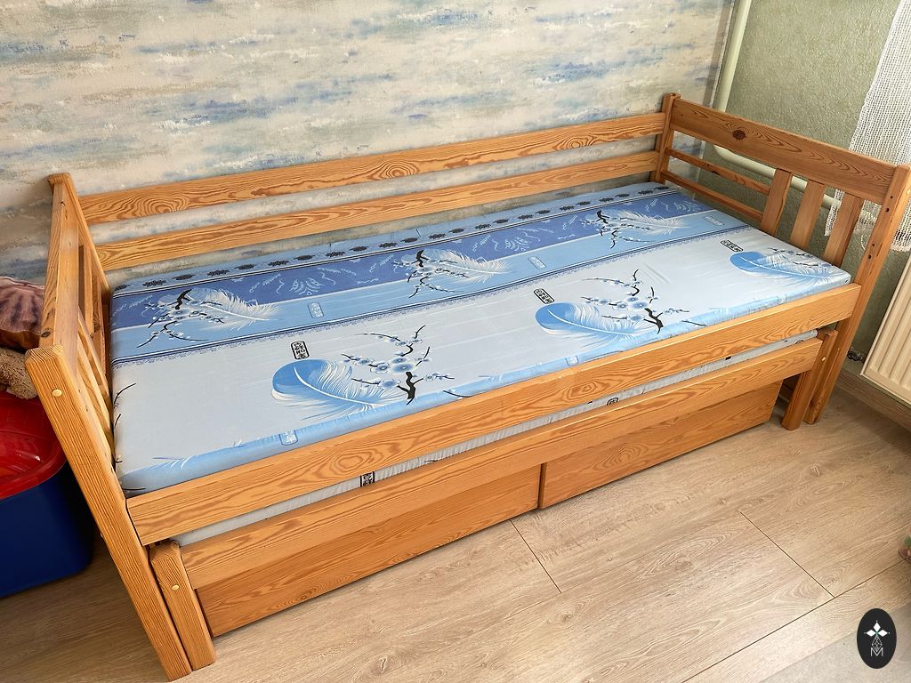 Деревянная кровать, которую можно использовать как двухъярусную, или как две отдельные кровати. Две вместительные коробки на колесиках. Два матраса (поролон), 90x190см. Зиепниеккалнс, или можно договориться о доставке в сторону Рига-Олайне.
