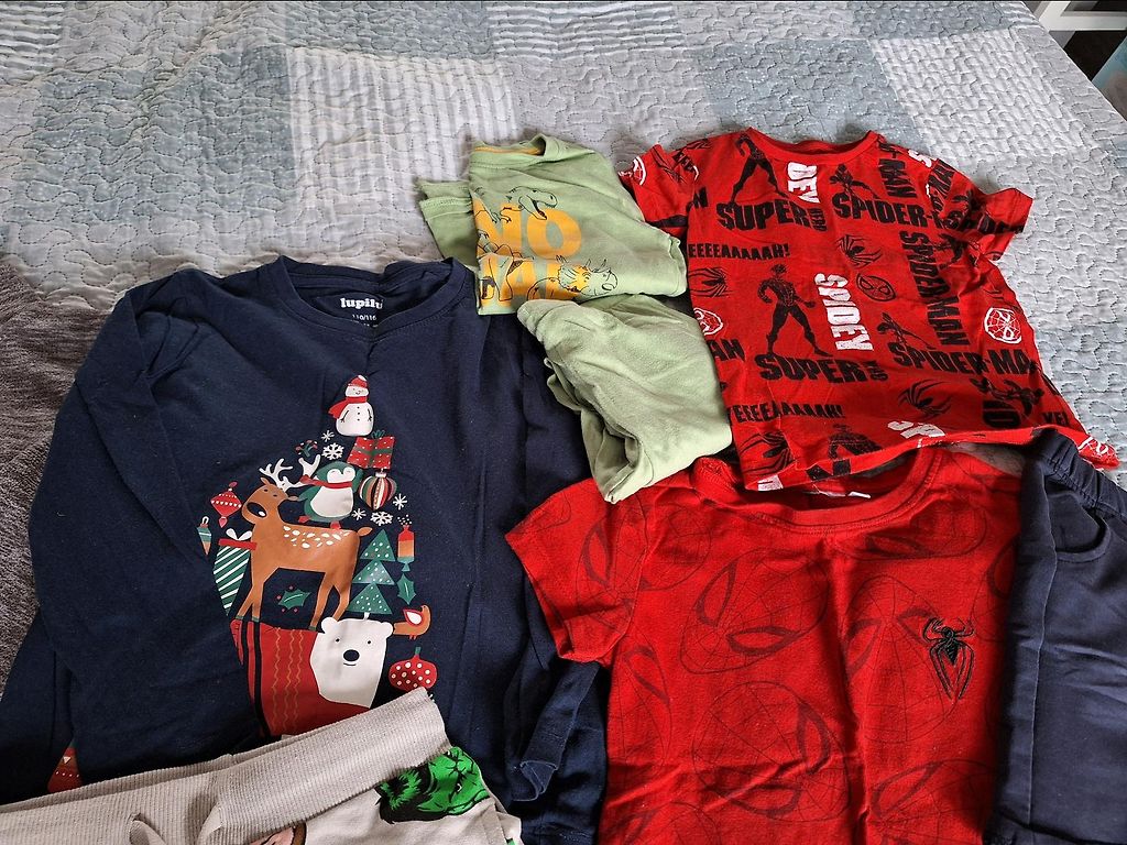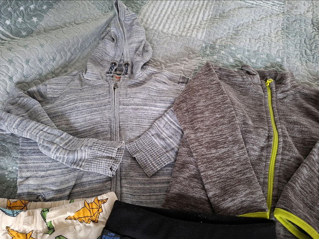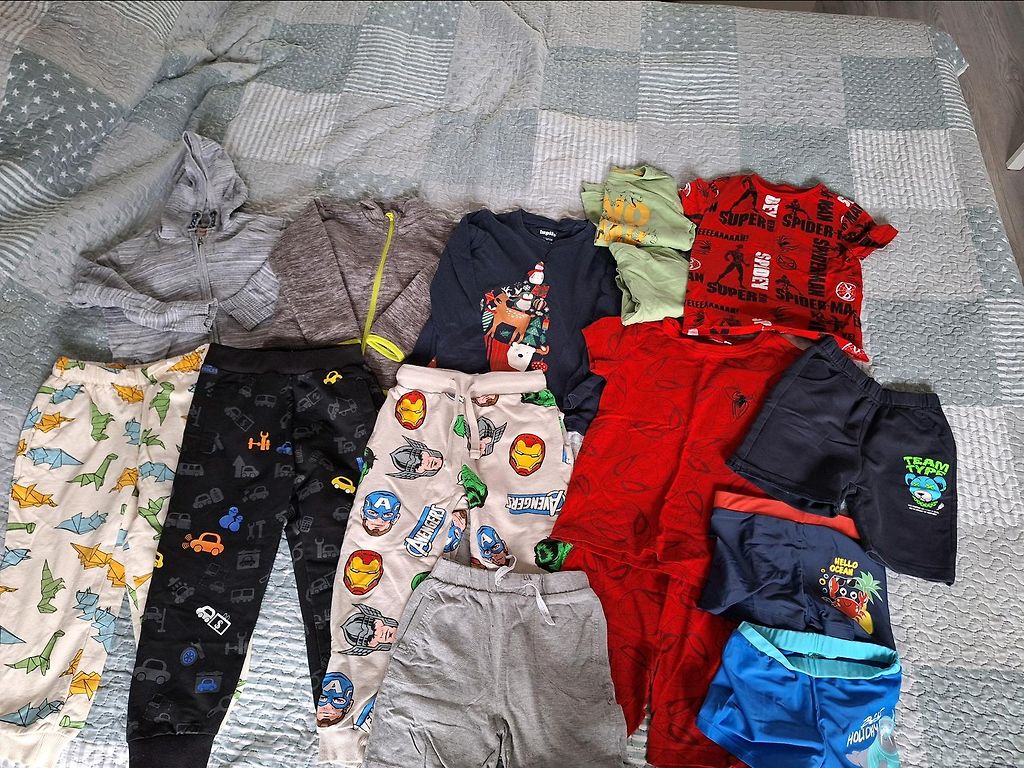 2 kampsunit, valge särk, 2 särki, püksid, 3 lühikesed püksid.
