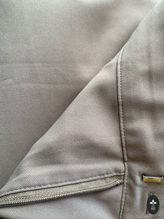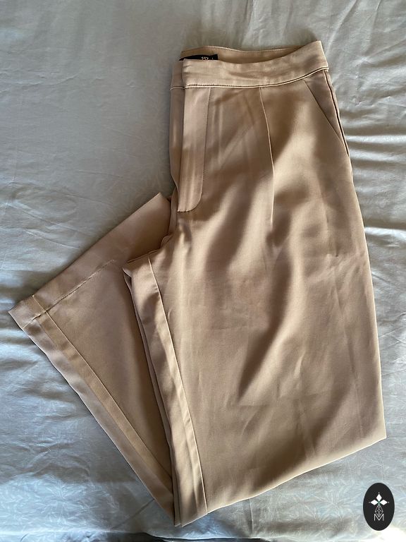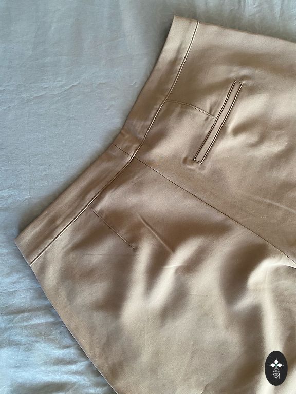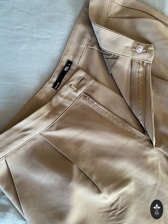 Smėliniai džinsai. Sudėtyje yra elastanas. Priekyje ir gale yra funkcionalios kišenės, kilpos diržui, užtrauktukas ir sagos užsegimas. Dydis L (46), ilgis 92 cm, vidinės siūlės ilgis 64 cm, liemuo 47 cm.