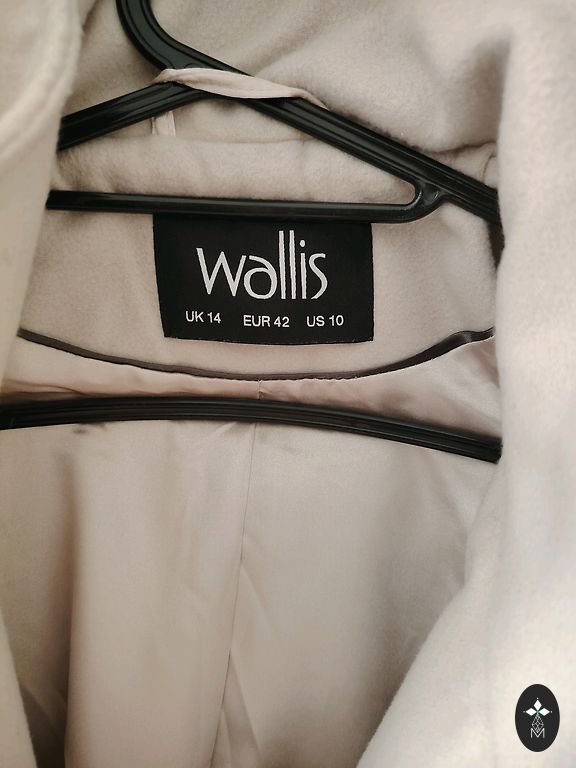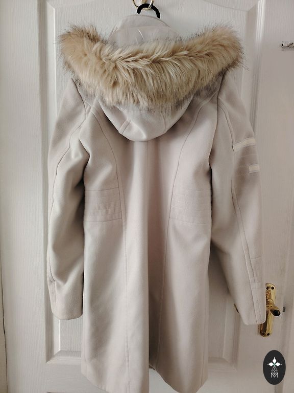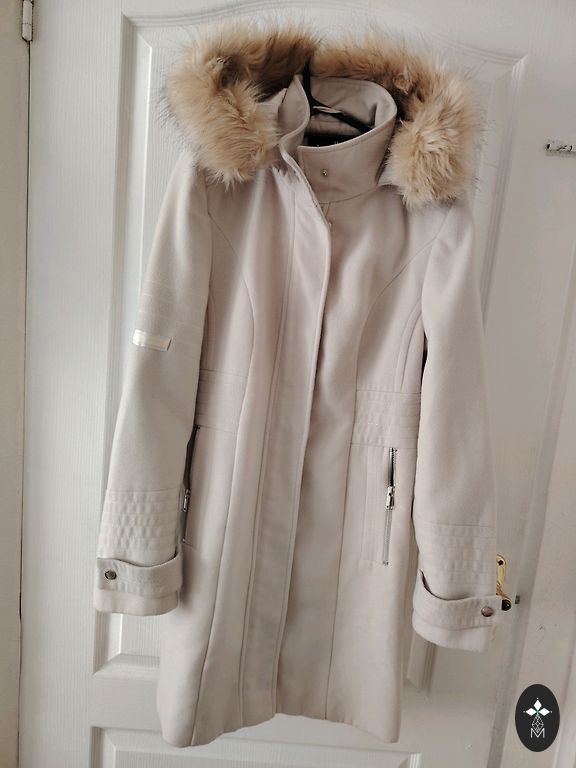 Элегантное, нежно-розовое пальто с женственным кроем и декоративными пуговицами, хорошо сохранившееся и идеально подходящее для весеннего или осеннего сезона. Длина от плеча до нижнего края - 90 см.