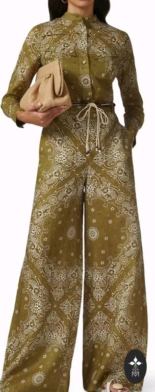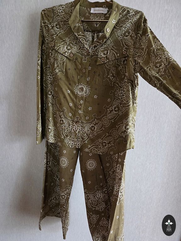Stilingas vasaros kostiumas su juosta, kurią galima surišti tiek priekyje, tiek gale, juosmu yra su gumine juosta. Tiks ir M dydžio, kelnių šonų yra dekoratyviniai skeltukai, defektų nėra.