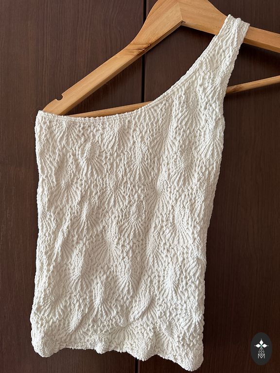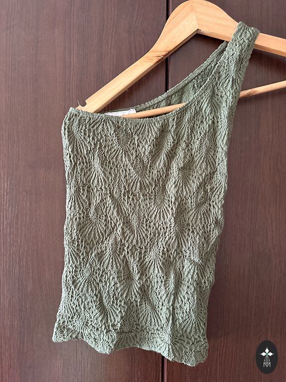 98% cotton and 2% elastane for comfort. :) In real life, it looks like thin denim fabric. Beautifully highlights the waist. Beautiful both with pants and skirts. Size indicated as 38, will fit sizes 36-38. Can be tried on in the Children's World area. Suitable for 1.67m.