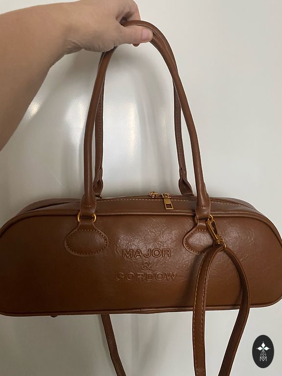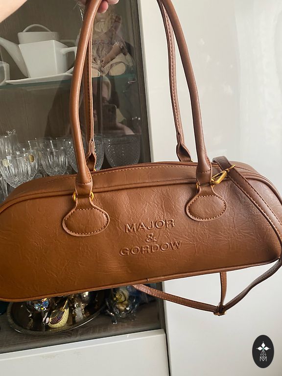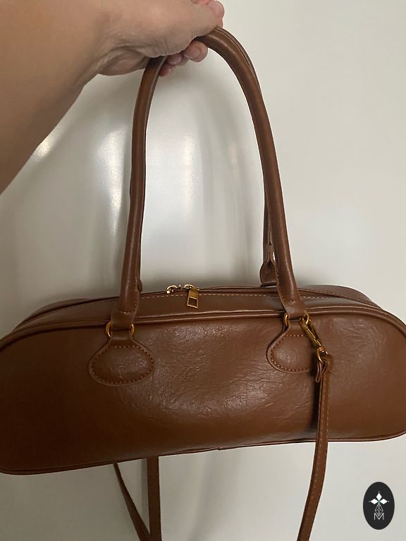 Small size handbag in light brown color. Small, but very spacious! Two inner compartments. Each closes separately. The partition is rigid. At the bottom 4 metal legs. Removable long handle.