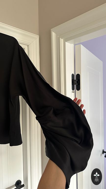 Beveik nedėvėta asimetriška suknelė, kuri labai gražiai atrodo ant kūno, su rankovėmis, kurių plotis reguliuojamas užtrauktukais